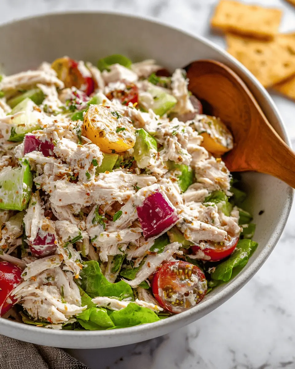 This chicken salad is incredibly versatile! You could serve it on whole grain bread for a tasty sandwich, on a bed of greens for a light meal, or with crunchy crackers for a quick snack. For an extra kick, pair it with some sliced veggies or tortilla chips for that perfect crunch.