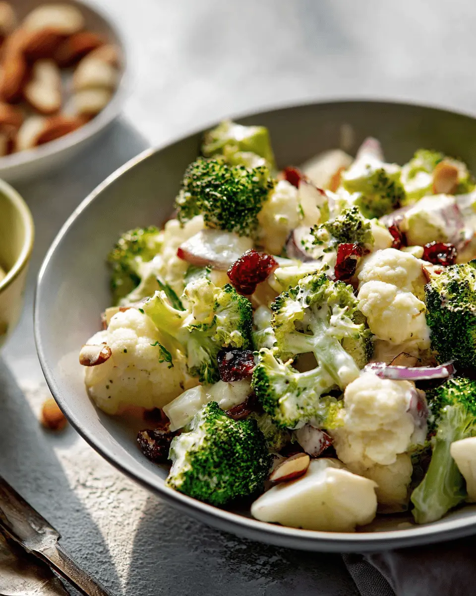 Feel free to get creative with the fruits and nuts in your Apple Broccoli Cauliflower Salad. Swap the apple for pear or orange slices for a fresh twist, and try different nuts like walnuts or sunflower seeds for added crunch. Dried fruits like apricots or cherries can enhance sweetness, while a sprinkle of pumpkin seeds provides a seasonal touch. Explore these variations to find new favorite flavors!