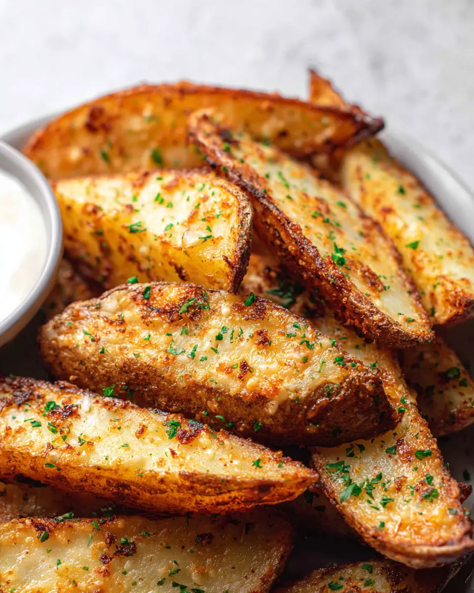 Once your potato wedges are beautifully baked, remove them from the oven and sprinkle with freshly chopped parsley for a burst of color and freshness. Serve them alongside ranch or blue cheese dressing for dipping—this adds a delicious contrast to the crispy wedges. Perfect for a movie night or as a side dish for any meal, these Baked Garlic Parmesan Potato Wedges are sure to impress both family and friends!