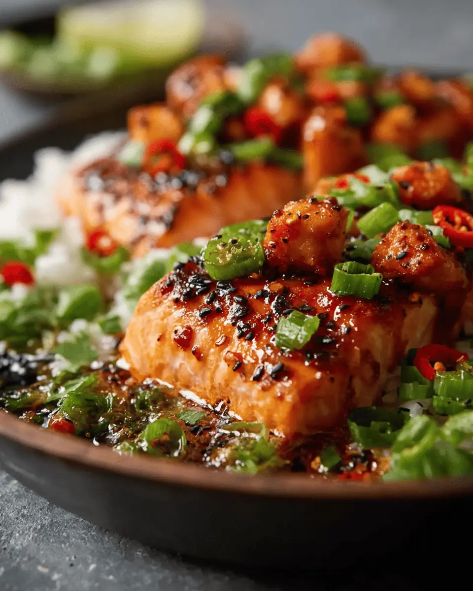 Now you have an impressive Bang Bang Salmon dish that's not only tasty but also visually delightful. Enjoy!