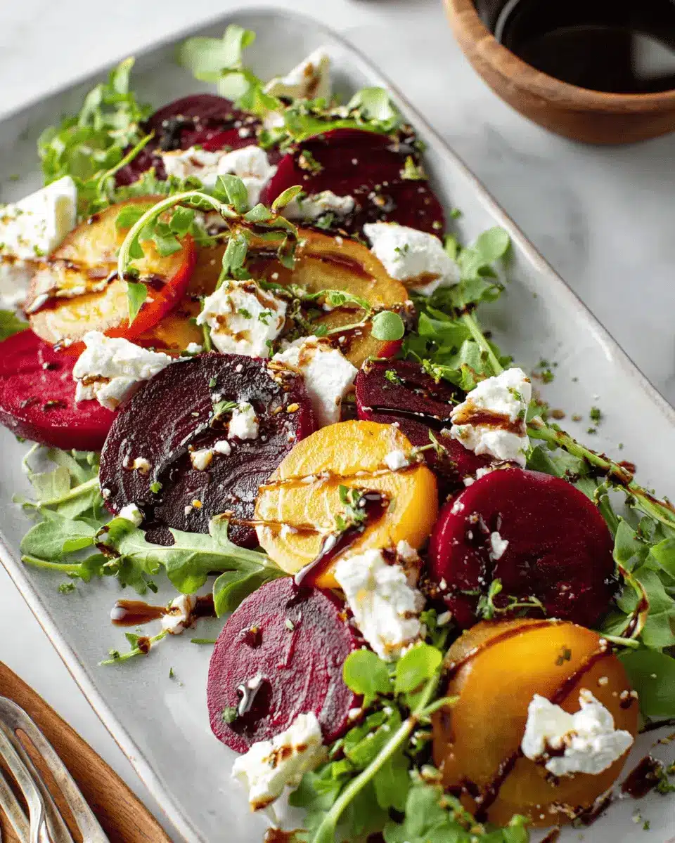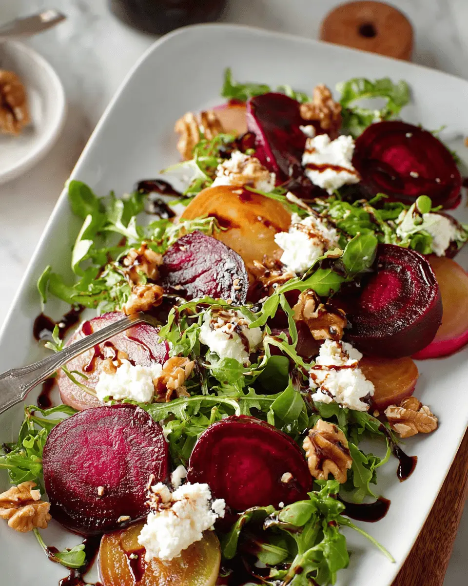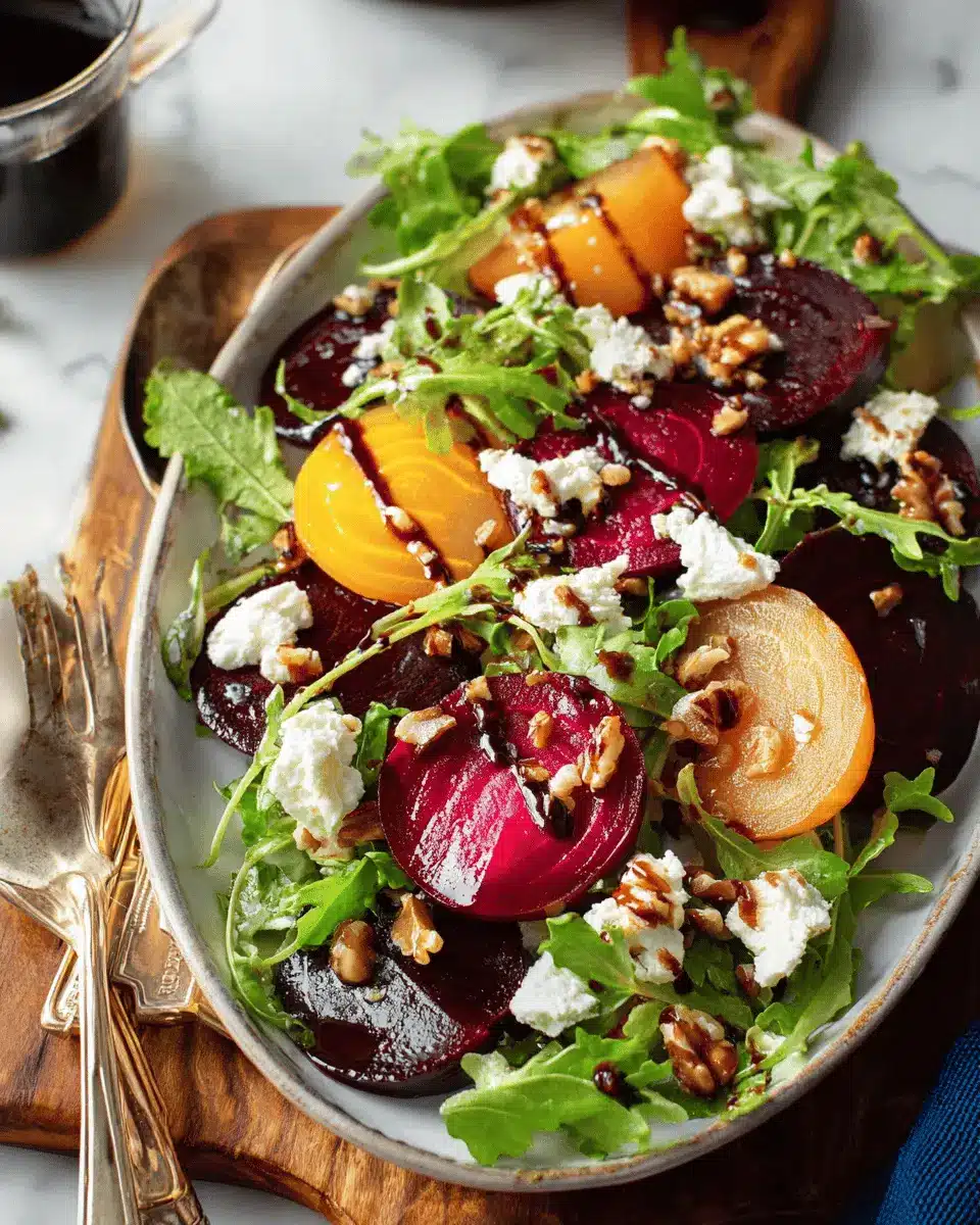 Slice the cooled beets into ¼-inch-thick rounds. For your salad base, choose a mix of arugula or spring greens for a peppery note, then layer on sliced shallots and green apples for crunch and brightness. Finally, toss in those gorgeous beet slices, and sprinkle toasted walnuts and torn goat cheese on top for that creamy finish. If you’d like, fresh microgreens can bring an extra touch of elegance to your dish.