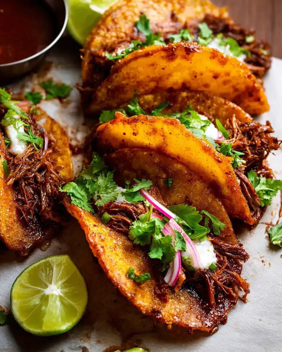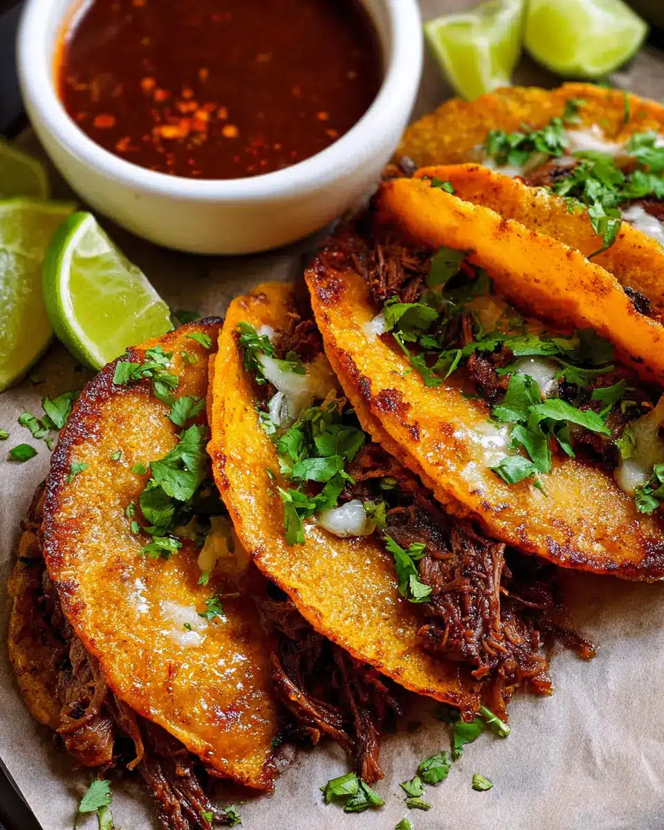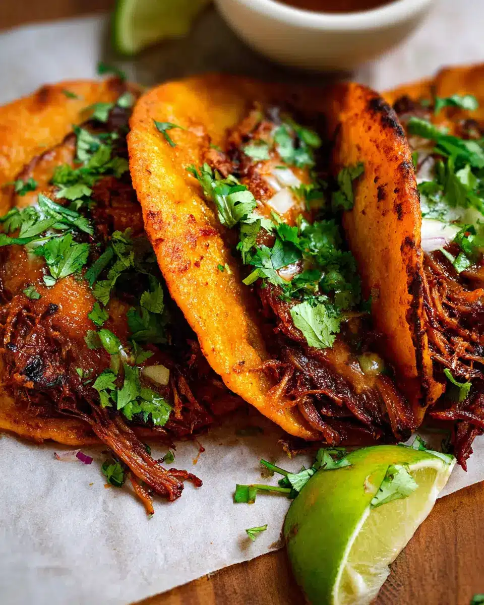 If you love birria tacos but are looking for a plant-based twist, try making a hearty vegetarian version! Substitute the traditional beef with jackfruit or sautéed mushrooms for a savory, satisfying alternative. Add a generous mix of spices to replicate that aromatic depth. Finish with your favorite toppings like diced onions, fresh cilantro, and a squeeze of lime for a burst of zesty flavor that will make these tacos unforgettable.