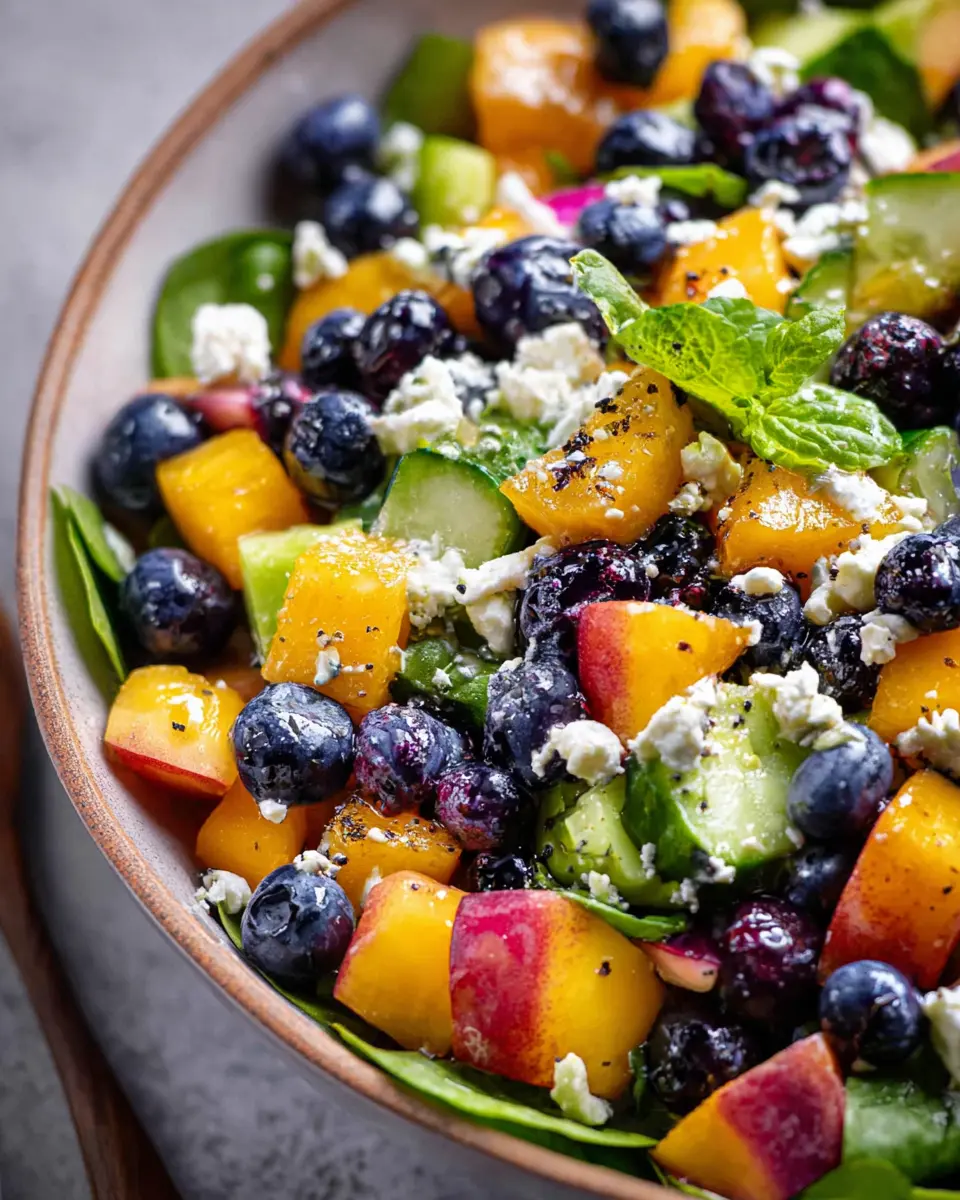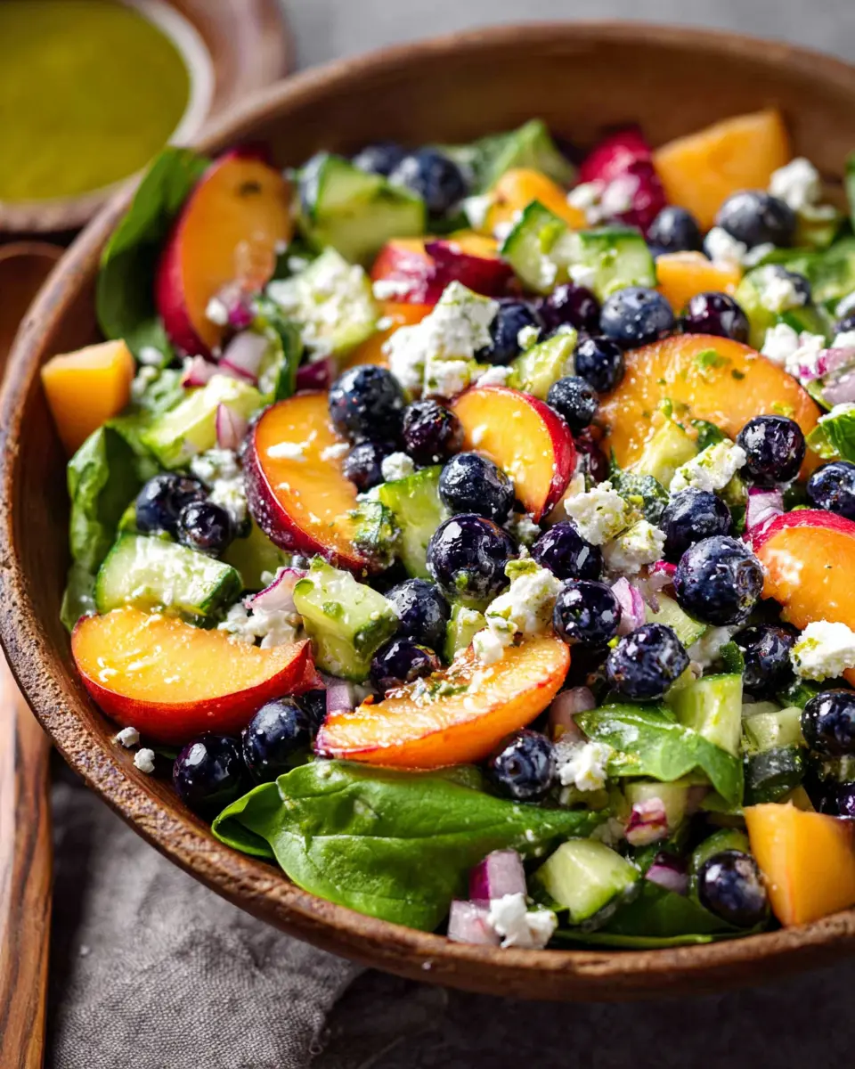 Begin your Blueberry Peach Feta Salad journey by prepping the fresh ingredients. Rinse the blueberries under cold water and set them aside. For the peaches, make sure to remove the pit and chop them into bite-sized pieces. Fresh, ripe peaches provide a juicy sweetness that perfectly complements the blueberries, so choosing quality fruit is essential.