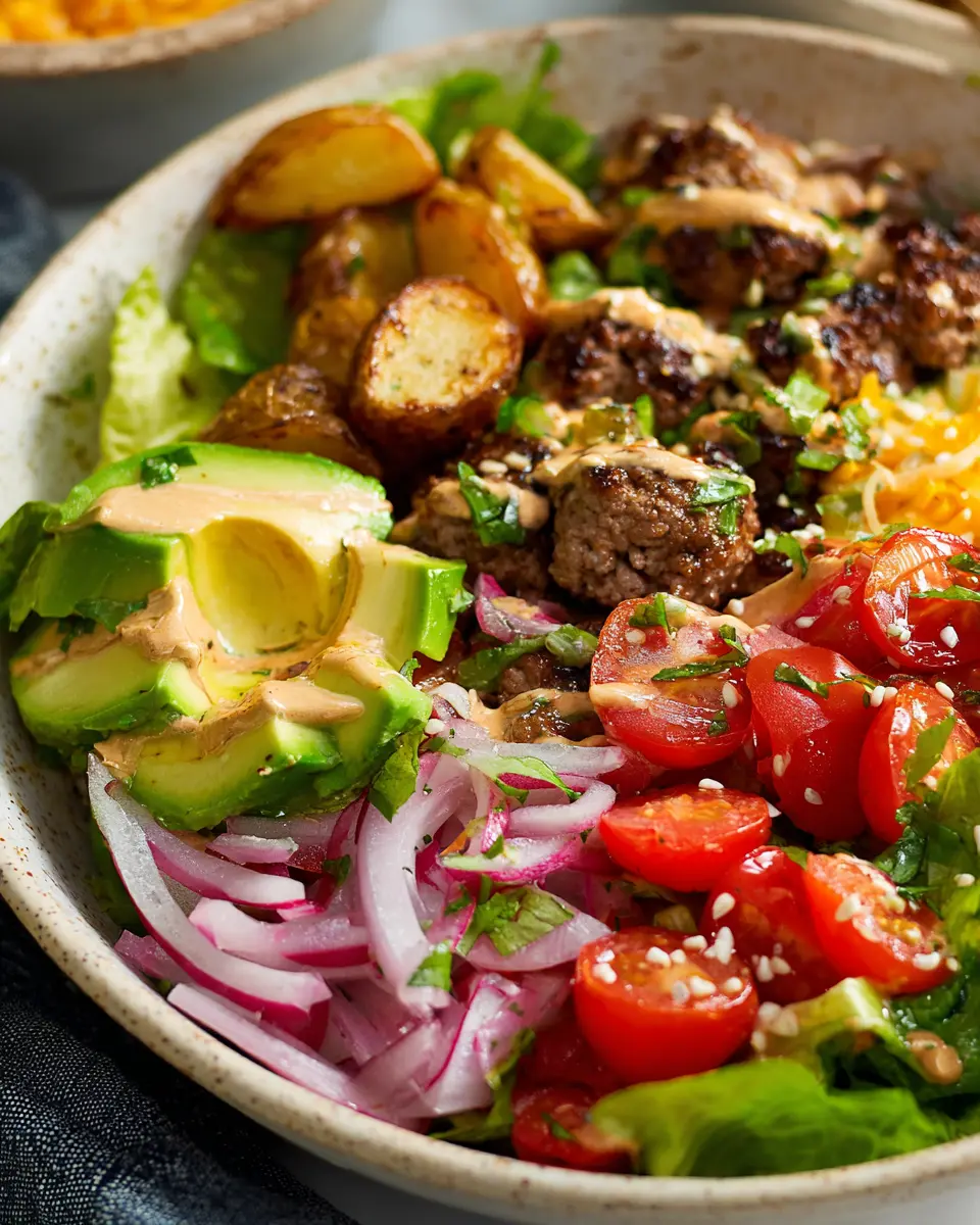 When you’re juggling work, social commitments, and a busy lifestyle, burger bowls become a lifesaver. They require minimal effort, allowing you to whip up a wholesome meal without spending hours in the kitchen. Picture this: tender ground beef, fresh romaine lettuce, and roasted potatoes all piled together in one comforting dish. It’s satisfying and customizable!