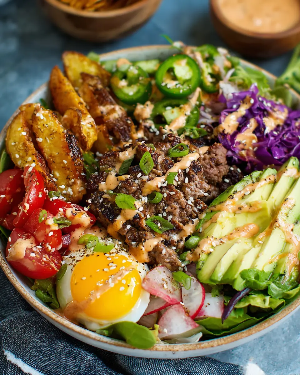 As your fries are baking, let’s whip up a mouthwatering burger sauce that pulls everything together. In a small bowl, combine 3 tablespoons of plain Greek yogurt, 3 tablespoons of mayonnaise, 3 tablespoons of ketchup, and add in 1 ½ teaspoons of mustard, ½ teaspoon of paprika, and a pinch of cayenne pepper (adjust to your spice preference). Mix it well and season with salt and pepper. This sauce gives your burger bowls that signature flavor we all crave!