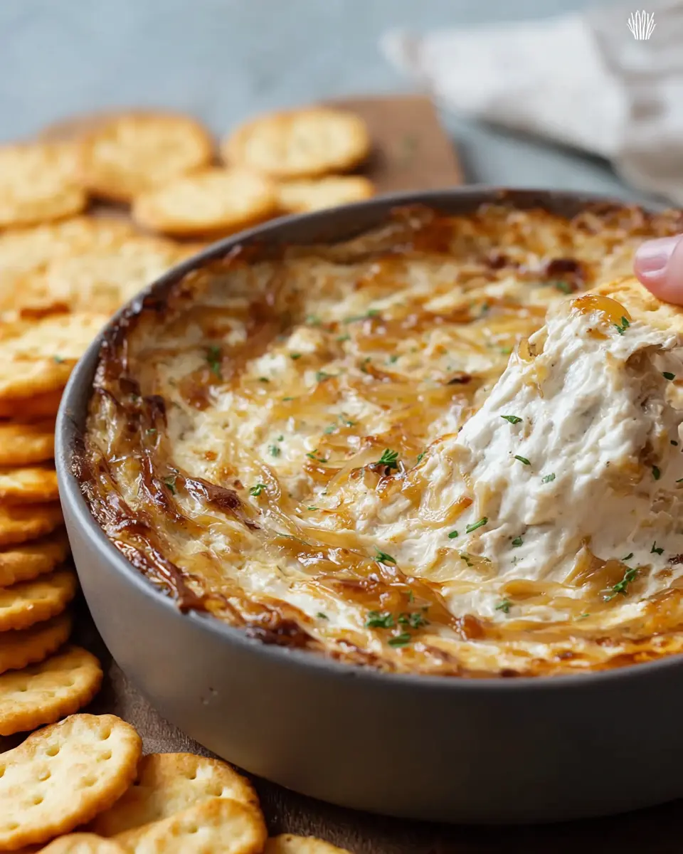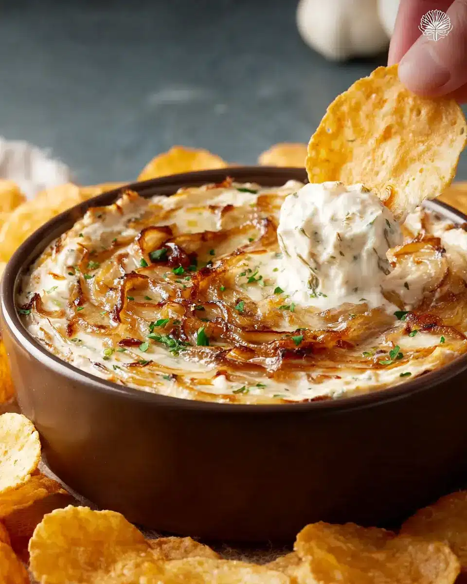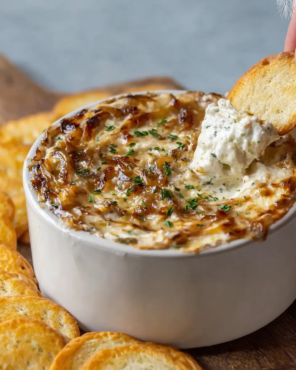 In conclusion, this caramelized French onion dip is the ultimate crowd-pleaser, perfect for your next gathering or movie night. With its creamy texture and rich flavors, it pairs beautifully with chips or fresh vegetables. Don’t forget to let it chill to enhance those delicious flavors. Enjoy!