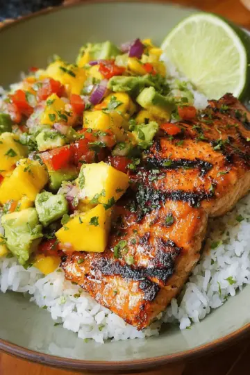 Grilled Lime Salmon with Avocado-Mango Salsa and Coconut Rice