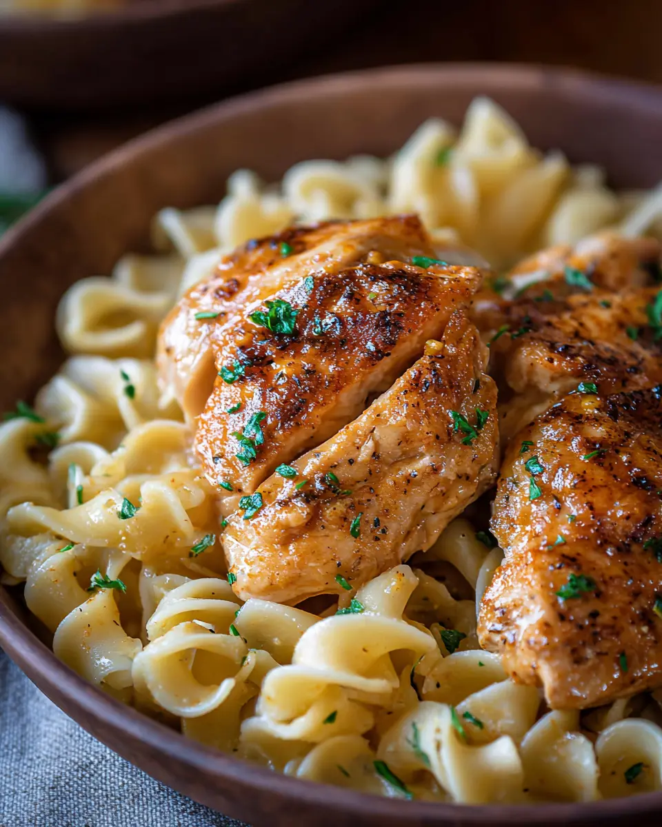 Pair your Chicken and Buttered Noodles with side dishes such as a crisp Caesar salad or steamed broccoli for a pop of color and nutrition. A soothing herbal tea or a refreshing sparkling water with lemon can complement the meal wonderfully. For something heartier, serve alongside some garlic bread to soak up the rich garlic butter sauce!