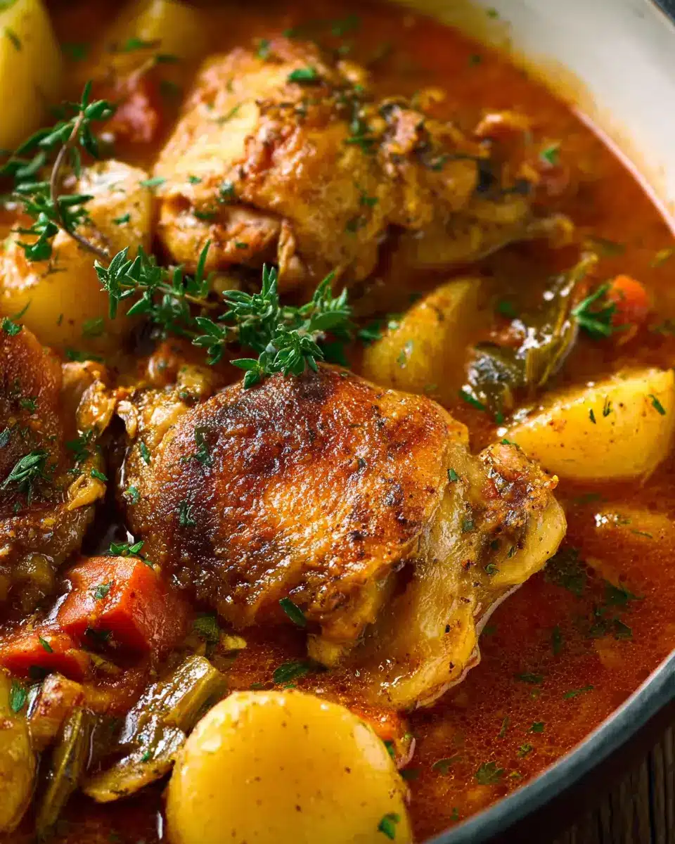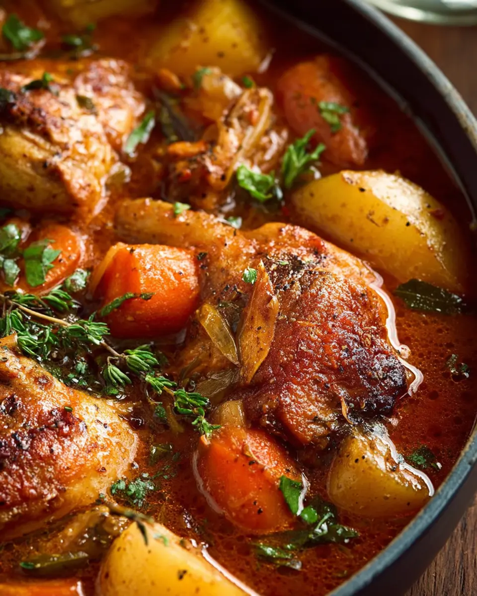 After the chicken is beautifully browned and the potatoes tender, give the sauce a taste and adjust the seasoning if necessary. Serve your chicken stew with a sprinkle of fresh herbs, and don’t forget some warm crusty bread for dunking. Your cozy meal is ready to enjoy!