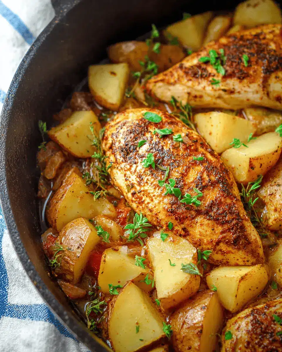 Once cooked, if your chicken is done but the potatoes need a bit more time, simply remove the chicken and keep it warm. You can also crush a few of the roasted garlic cloves and spread them over the chicken for a delightful burst of flavor. For a sweet twist, consider brushing the finished chicken with some pure maple syrup—it's a game changer! Finish by garnishing with fresh chopped parsley before serving. Revel in the hearty goodness of this Dutch Oven Chicken Breast and Potatoes recipe, perfect for any weeknight dinner or special occasion!