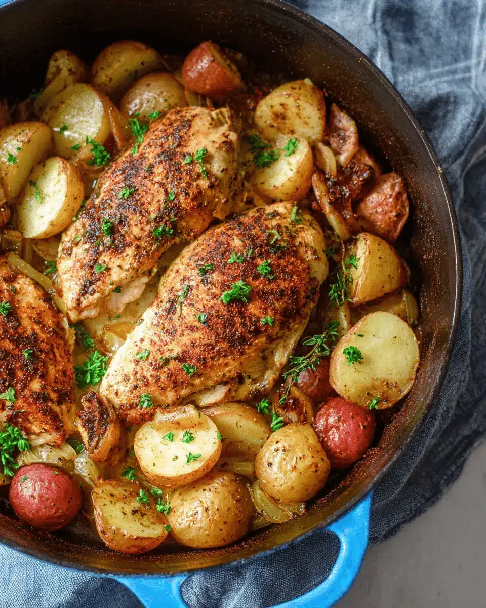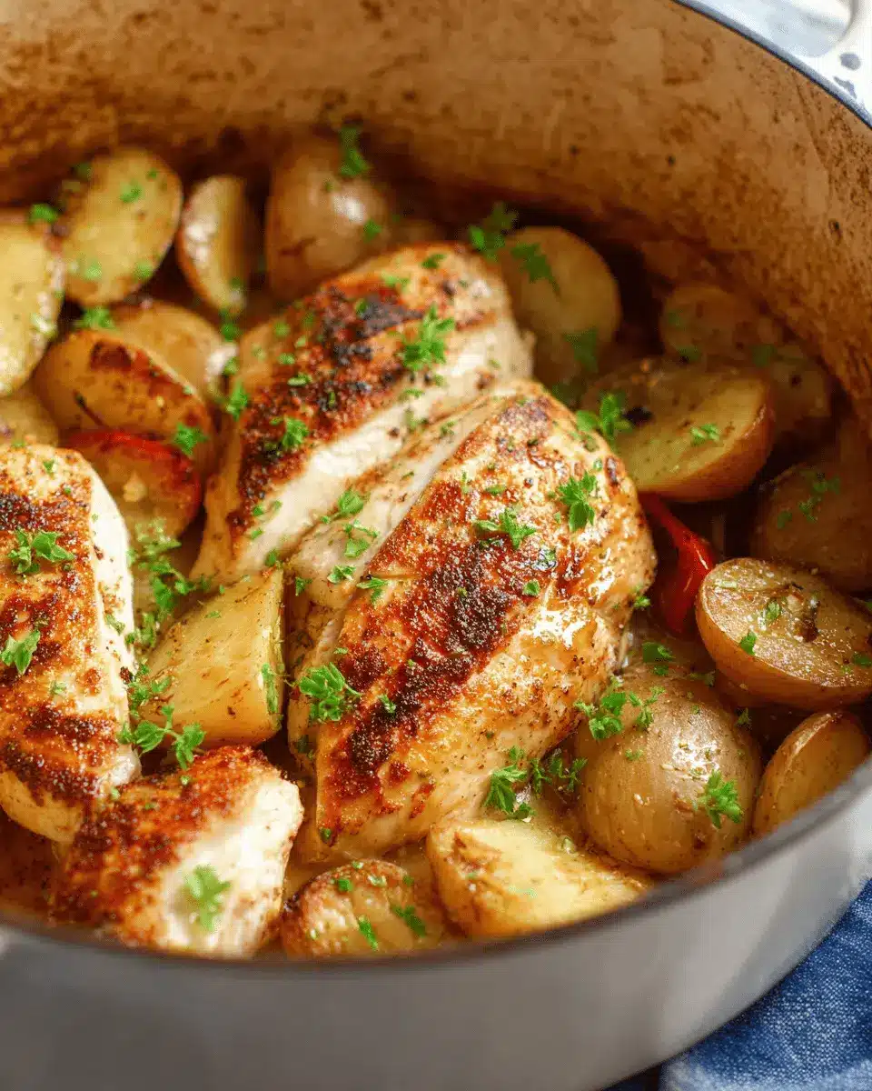 Now it’s time to bring everything together! Place the browned chicken breasts back into the Dutch oven, resting them on top of the seasoned potatoes. Cover the pot with a lid and bake in the preheated oven for 30 minutes. After this initial baking time, baste the chicken with the flavorful juices, cover again, and cook for an additional 15 minutes or until the chicken reaches an internal temperature of 165°F (74°C).