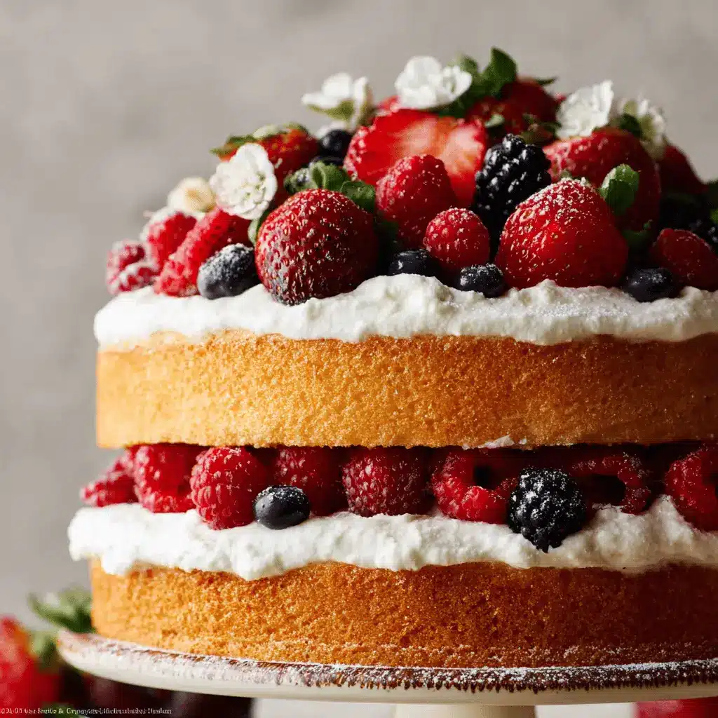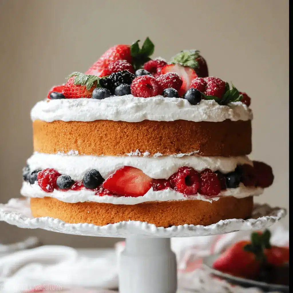 - Level the cooled cake layers if domed. Place one layer on a stand, spread whipped cream, and layer berries. Repeat with second layer, then top with third layer and remaining whipped cream and berries.