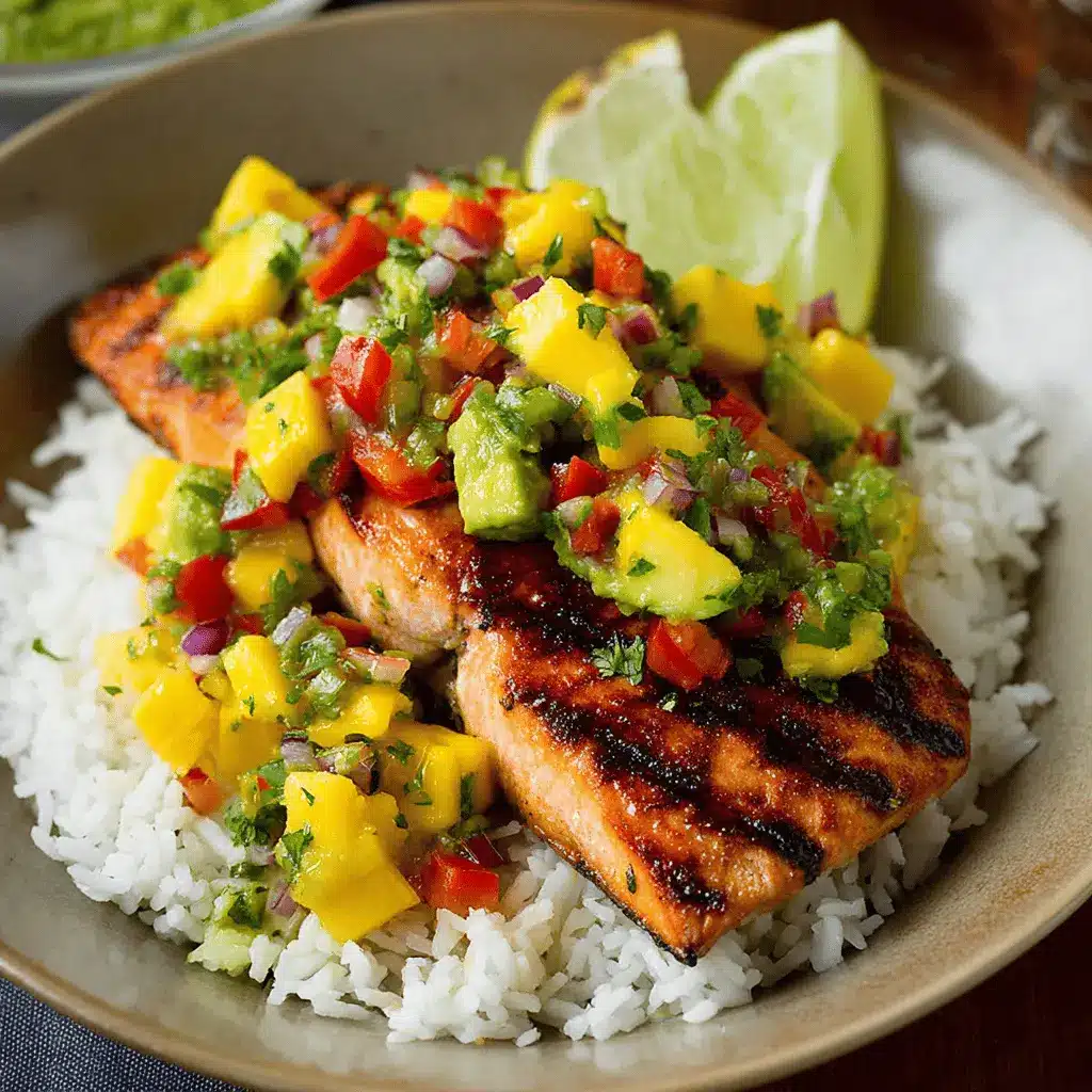 Grilled Lime Salmon with Avocado-Mango Salsa and Coconut Rice