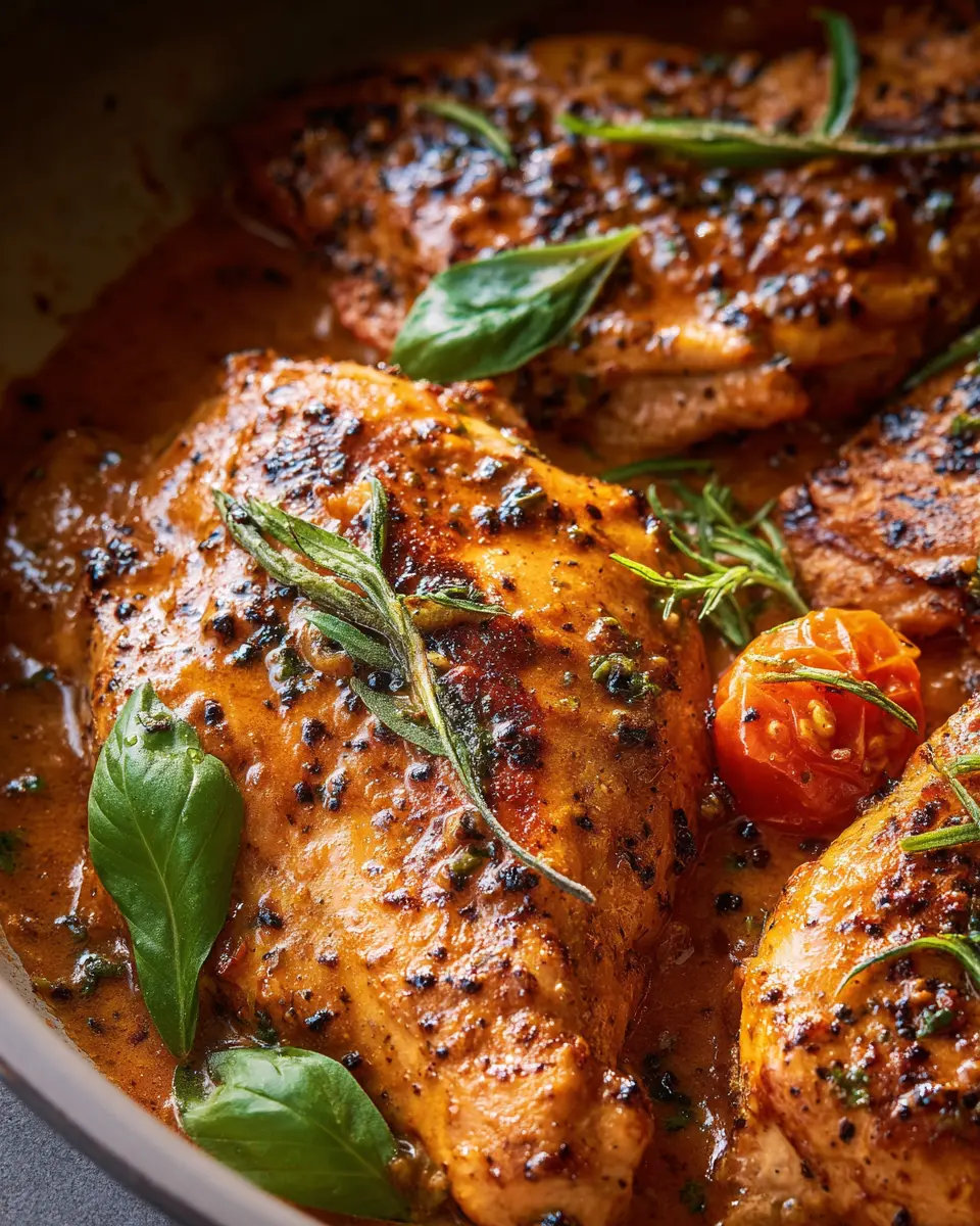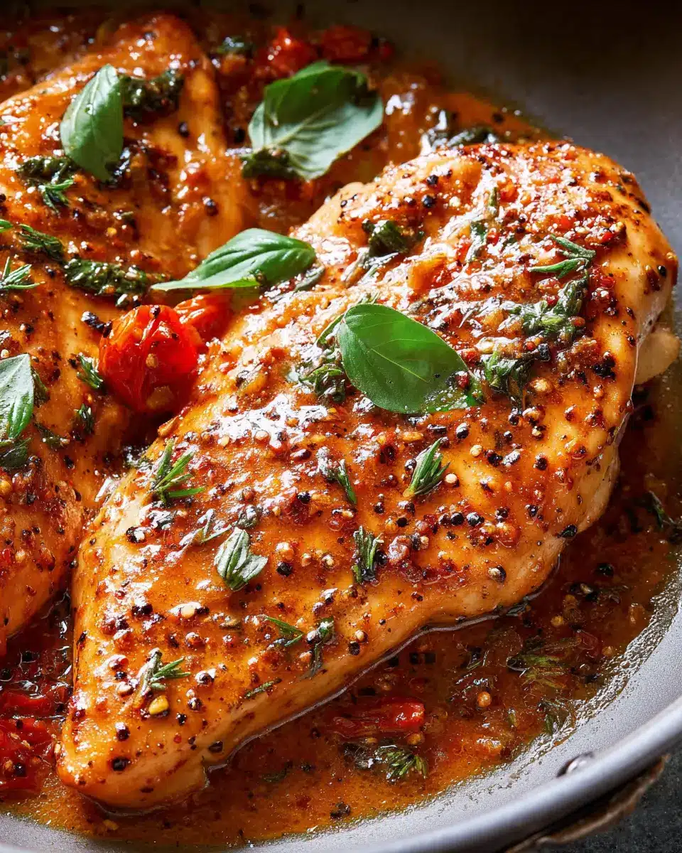 In the same skillet where you cooked the chicken, melt 1 tbsp. unsalted butter over medium-low heat. Add 2 finely chopped garlic cloves and ¼ tsp. crushed red pepper flakes, stirring for about 30 seconds until fragrant. This will unleash an incredible aroma that you just can’t resist! Return the chicken to the skillet, pour the creamy sauce over it, and toss in ½ cup of torn fresh basil leaves. Let it simmer for 5 to 7 minutes, spooning the sauce over the chicken occasionally until it thickens slightly.