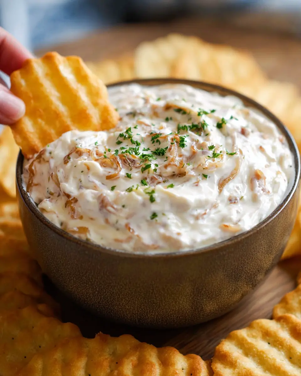 Plus, this dip is super versatile. Pair it with classic crinkle-cut potato chips, fresh veggie sticks, or even turkey bacon for a gourmet twist. The options are endless! If you’re looking for a crowd-pleaser that’s easy to make and utterly delicious, look no further than this homemade French onion dip. Give it a try, and watch your guests rave about it! For more tips on entertaining, check out this entertaining guide.