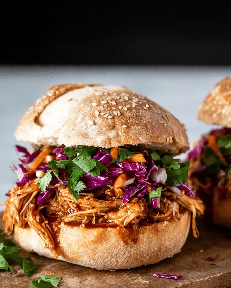 While your chicken is bubbling away, it's the perfect time to whip up a refreshing slaw. In a medium bowl, combine ½ cup shredded carrots, ½ cup shredded red cabbage, and ¼ cup chopped cilantro. Add 1 tablespoon of apple cider vinegar, ½ tablespoon of toasted sesame oil, and 1 teaspoon of pure maple syrup. Sprinkle in some freshly ground salt and pepper to taste. This slaw not only adds a vibrant crunch to your sandwich but also balances the sweetness of the pulled chicken.
