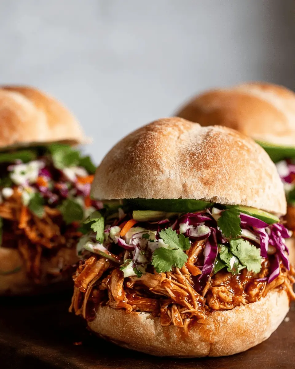 Now comes the moment of delicious assembly! Once your chicken is fork-shredded and mixed back into the sauce, grab your whole grain or gluten-free seedy hamburger buns. Use a slotted spoon to pile the succulent pulled chicken onto the bottom half of the bun, topping it with a generous scoop of your freshly made slaw. Place the top half of the bun over it, and voilà! You’ve got a mouthwatering sandwich that’s ready to impress friends, family, or just yourself after a long day.