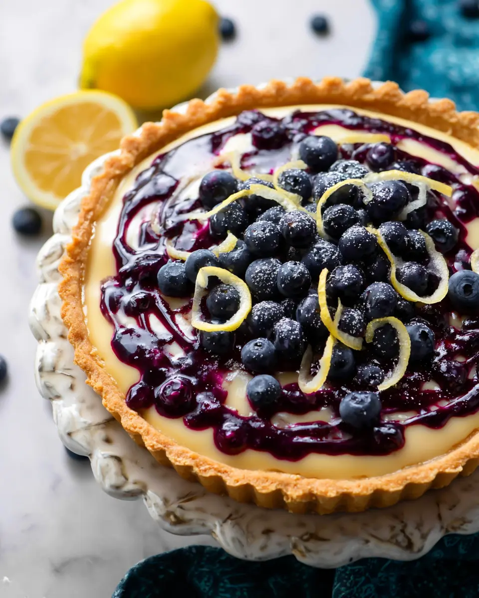 Preparing your lemon blueberry tart ahead of time can save you stress on the day you plan to serve it. You can bake, cool, and chill the tart a day in advance. Just remember, the filling needs to go into a warm crust, so it’s best to whip up the filling and blueberry sauce beforehand and refrigerate them until you’re ready to assemble. If the blueberry sauce thickens too much, simply warm it slightly on the stove or in the microwave.
