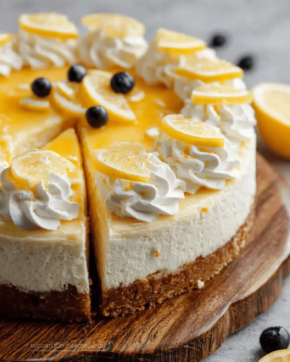 When it comes to presentation, garnishes can make all the difference! Consider decorating your cheesecake with elegant lemon slices, perhaps arranged in a circular pattern on top. You could also create a playful effect with a sprinkle of zest — it adds visual interest and hints at the delightful flavors waiting inside. A drizzle of lemon glaze or even an edible flower can add a touch of sophistication. For a pinch of color and freshness, scatter some fresh herbs like mint around the plate, inviting guests to dive into this citrusy delight!