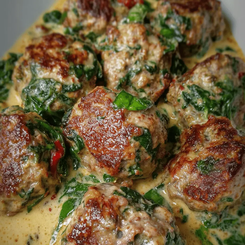 With the meatballs done, set them aside and let’s focus on the sauce. In the same skillet, melt 1 tablespoon of butter and toss in diced yellow onions along with a bit more garlic. Cook until the onions are soft and aromatic. Add in a drained jar of sun-dried tomatoes and stir to combine. Pour in ⅓ cup of vegetable broth and 1 ¾ cups of heavy cream, creating a creamy, luscious base. Then, add a handful of baby spinach and mix until it wilts—this not only enhances the flavor but also gives a pop of color!