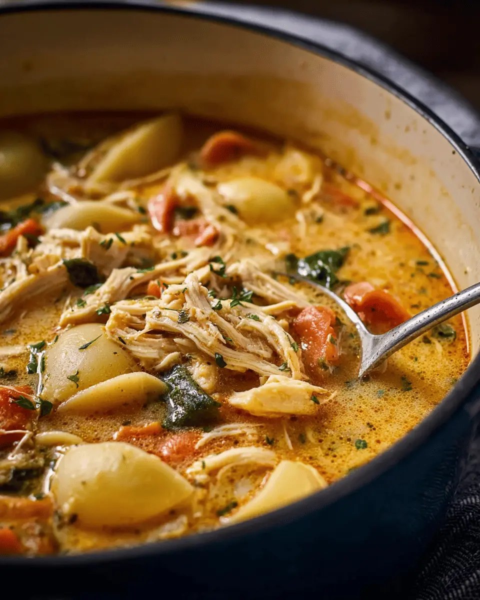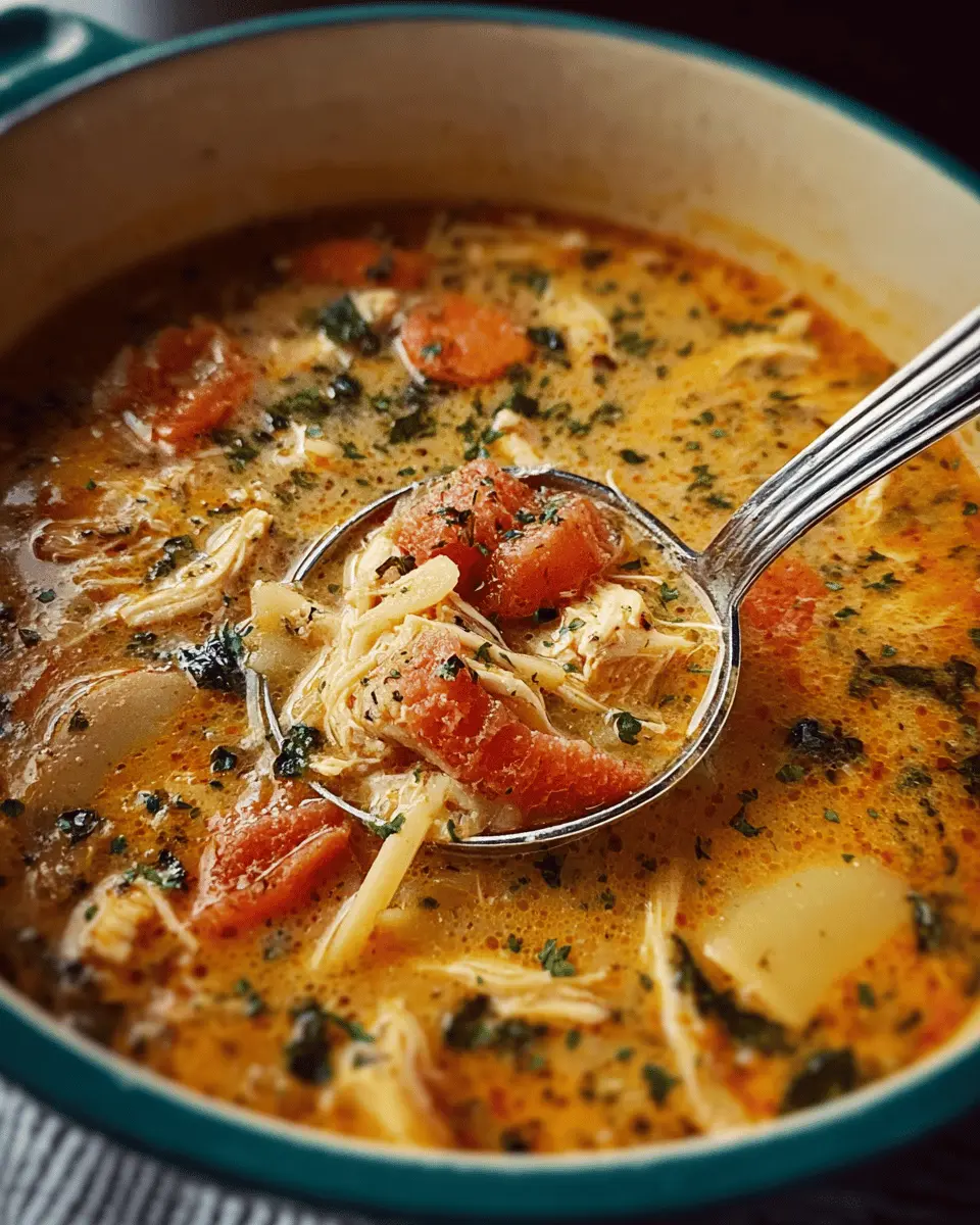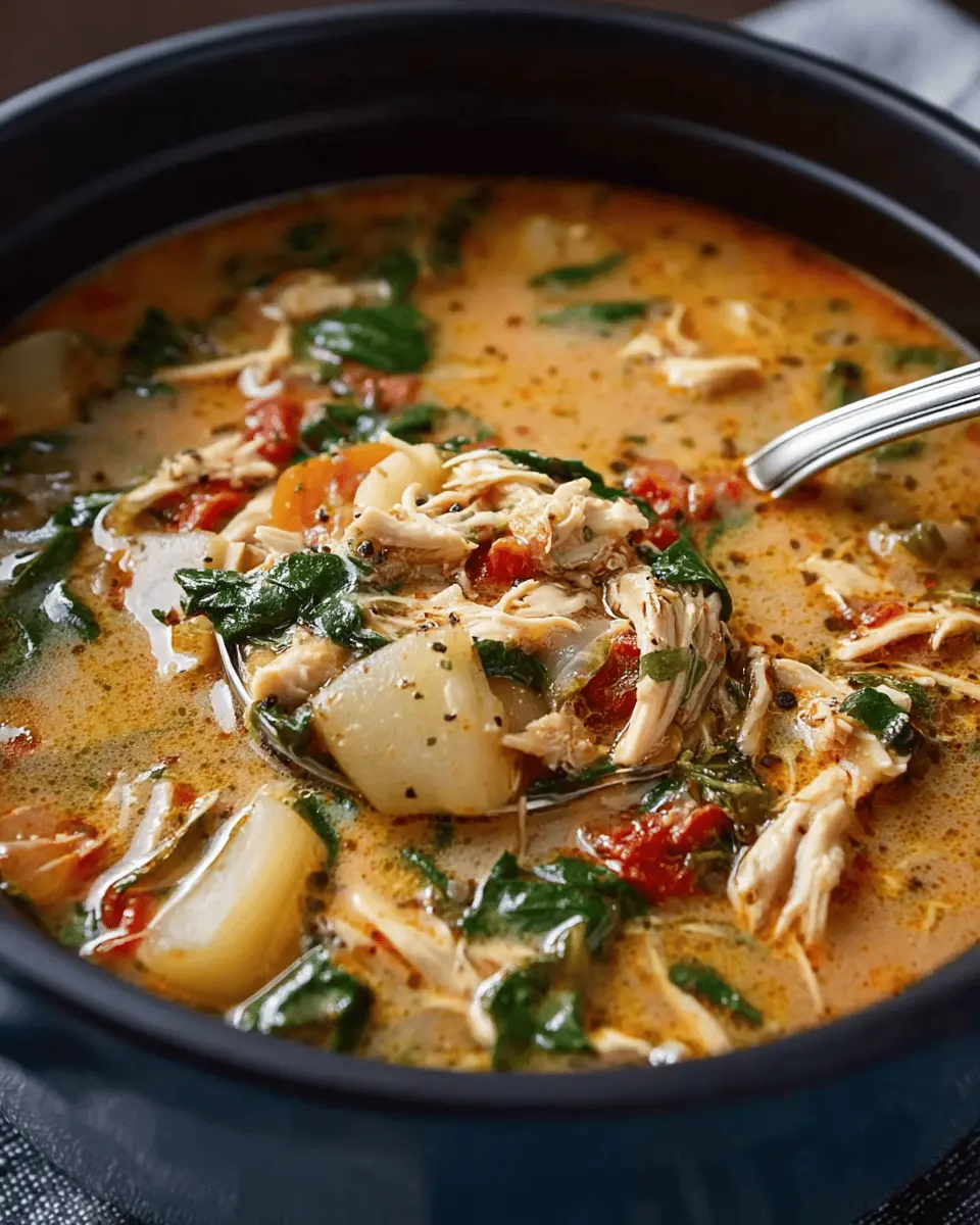 Lower the heat and introduce the fresh baby spinach, shredded rotisserie chicken, cream cheese, and Parmesan cheese into the pot. Stir frequently until the cream cheese and Parmesan melt beautifully and the chicken is heated through. This should take around 5 minutes. The soup will turn creamy and luscious, transforming it into something truly comforting.