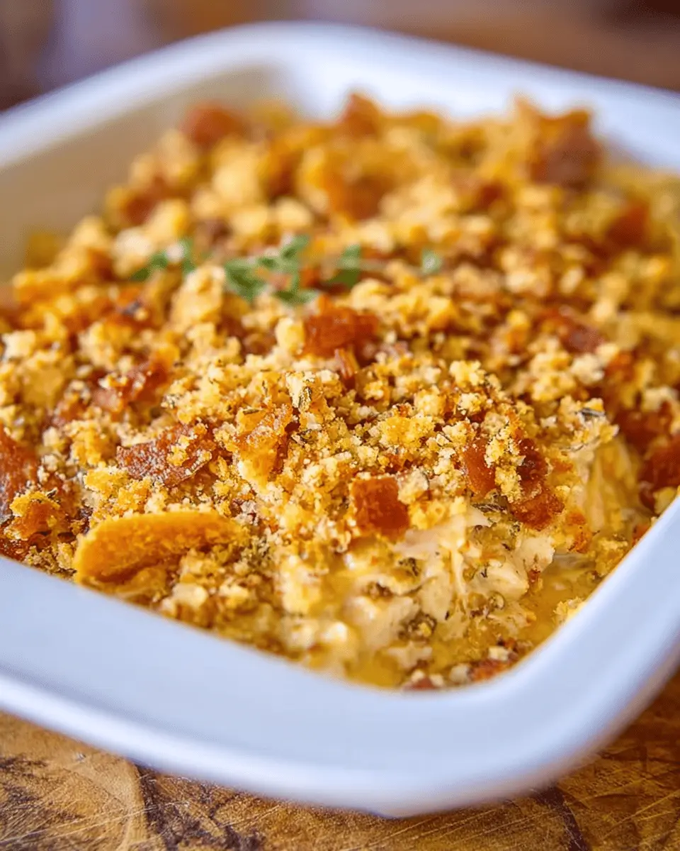To create that irresistible crunchy topping, take 1 sleeve of crushed Ritz crackers and mix them with 5 tablespoon of melted butter. This combination brings a delightful texture contrast to the rich filling. Sprinkle this mixture generously over the chicken layer, covering it entirely for that perfect crunch in each bite.