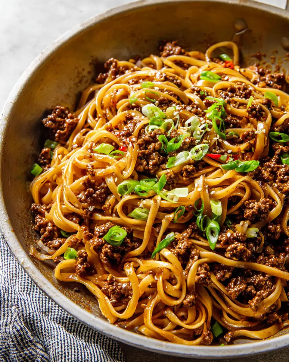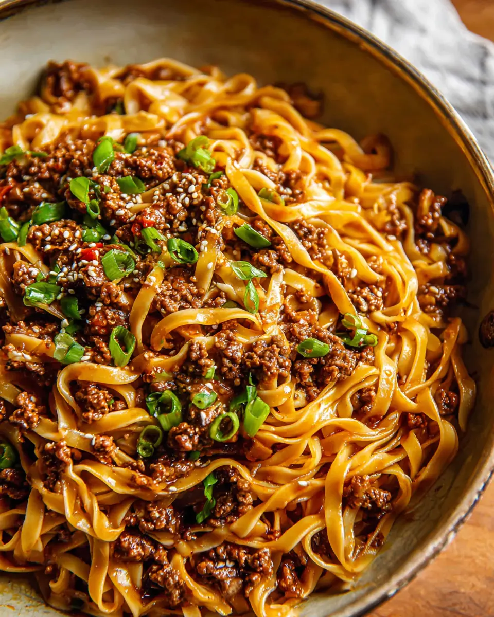 To make your Mongolian Ground Beef Noodles truly shine, serve them in shallow bowls and arrange a nest of noodles in the center. Top with a generous scoop of the flavorful beef mixture, allowing the sauce to cascade down the sides. Finish with a sprinkle of green onions and white sesame seeds for a pop of color. For an elevated touch, consider adding a side of quick-pickled vegetables or cucumber salad to complement the richness of the dish.