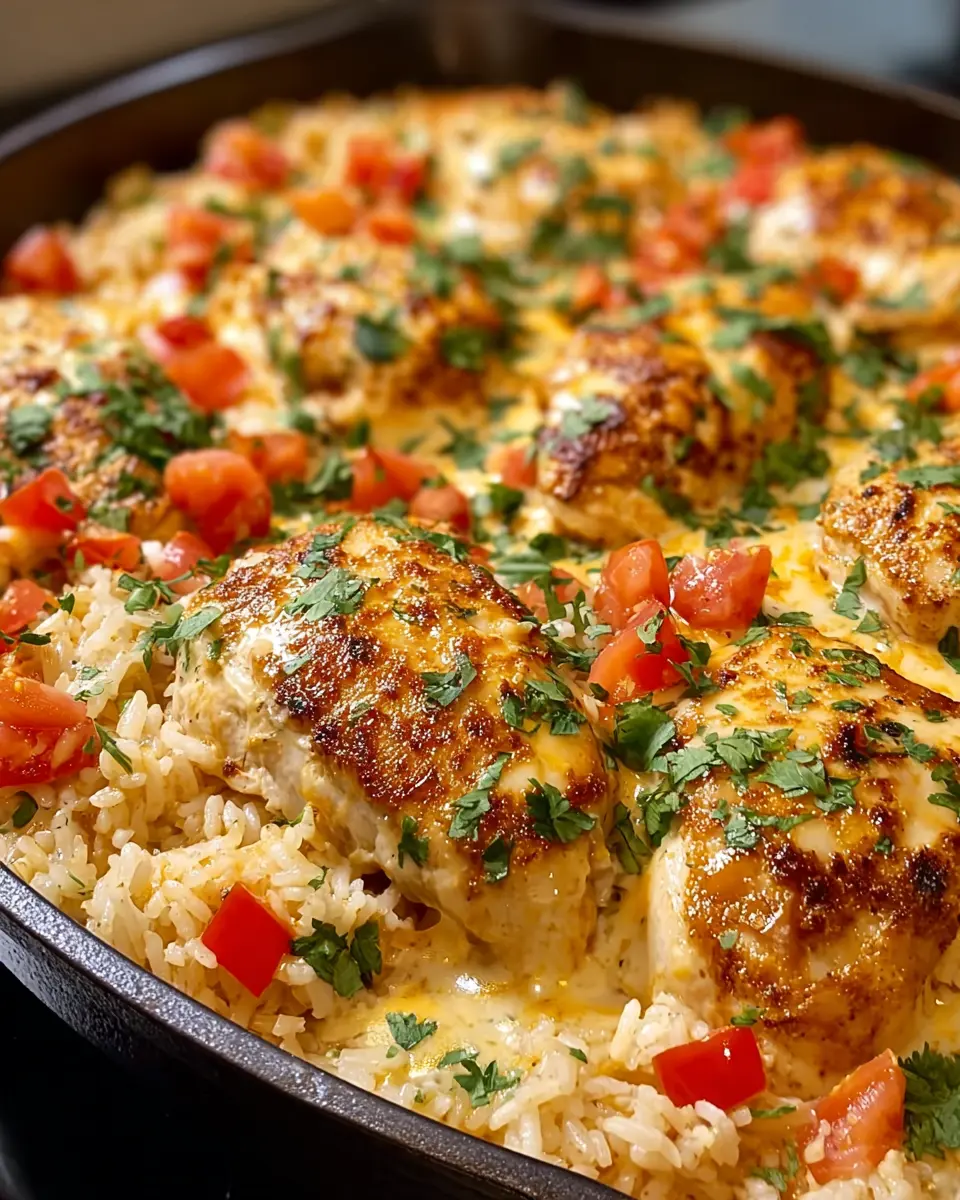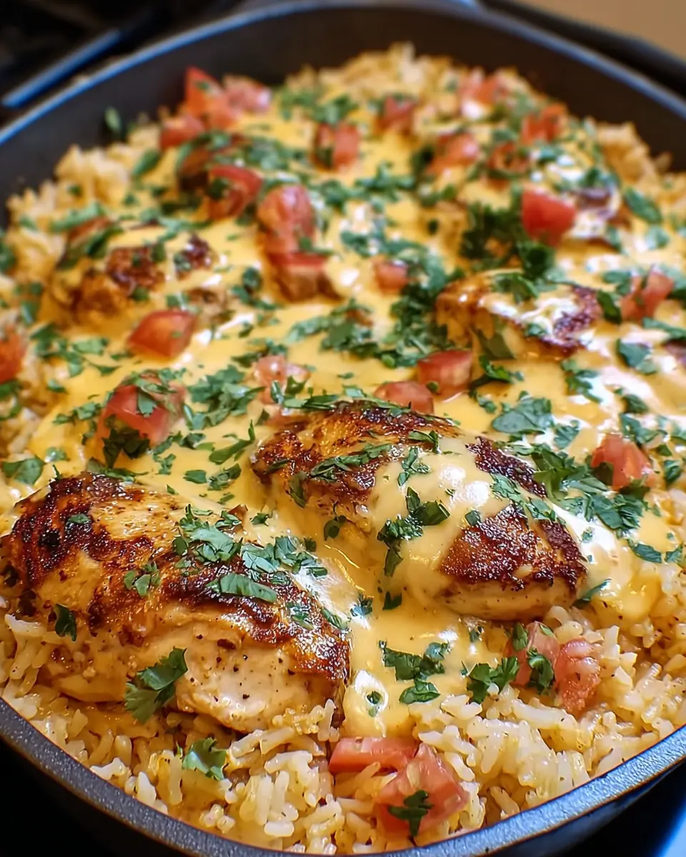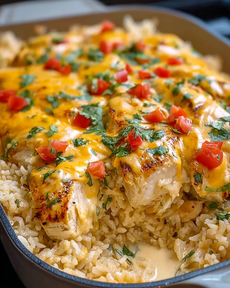 Don’t forget to let your queso chicken and rice bake rest for a few minutes after taking it out of the oven. Garnish with chopped tomatoes and cilantro for that fresh touch, and enjoy! This dish pairs wonderfully with a simple side salad or some tortilla chips.