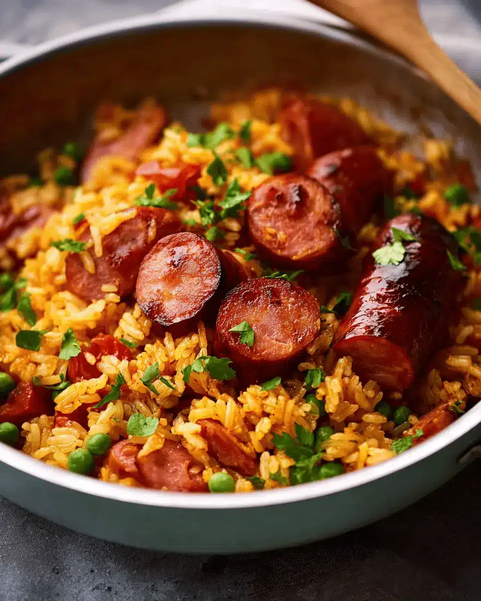 Once you start cooking, expect to spend around 30 minutes on the stovetop. This includes frying the sausages and letting the rice simmer to perfection.