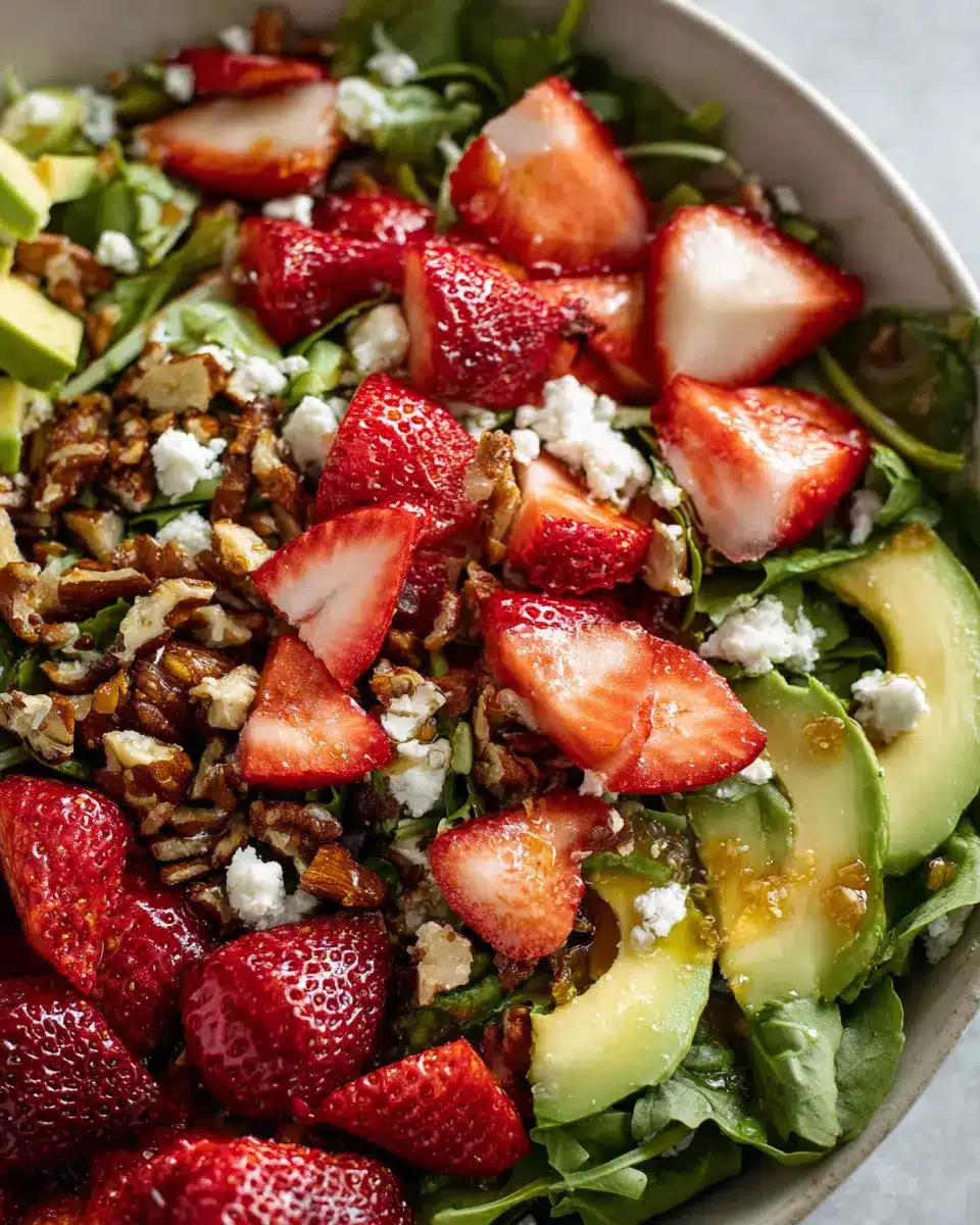 Absolutely! You can prep the ingredients for your strawberry crunch salad up to a day ahead. Just store the sliced strawberries, chopped avocado, and dressed arugula separately in the fridge, so they stay fresh and crisp. When you’re ready to serve, simply toss everything together with the champagne vinaigrette. This way, the salad remains vibrant and delicious!