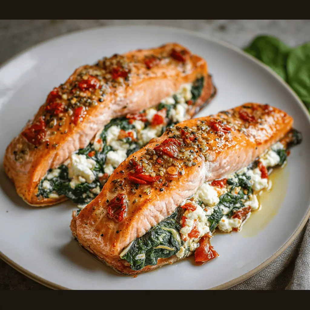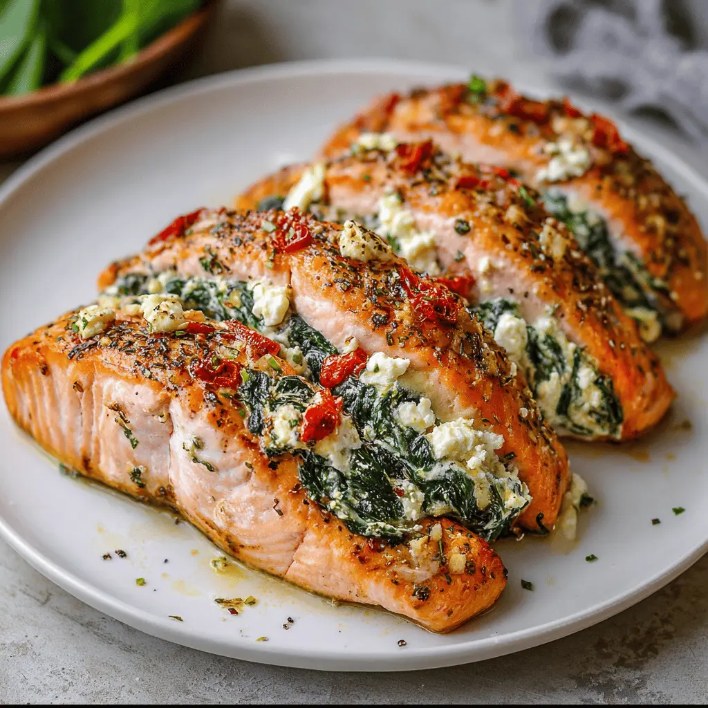 Want to switch things up? Easily customize this dish! If you're avoiding dairy, try using a vegan feta substitute. For a gluten-free twist, swap out the roasted red peppers for fresh herbs like dill or mint. This flexibility means you can enjoy the flavors of stuffed salmon with spinach & feta no matter your dietary needs!