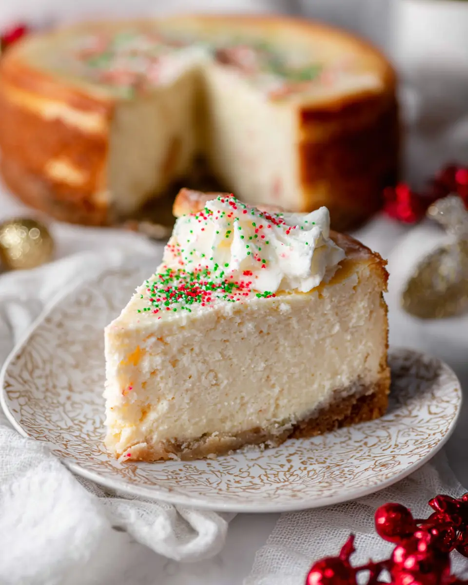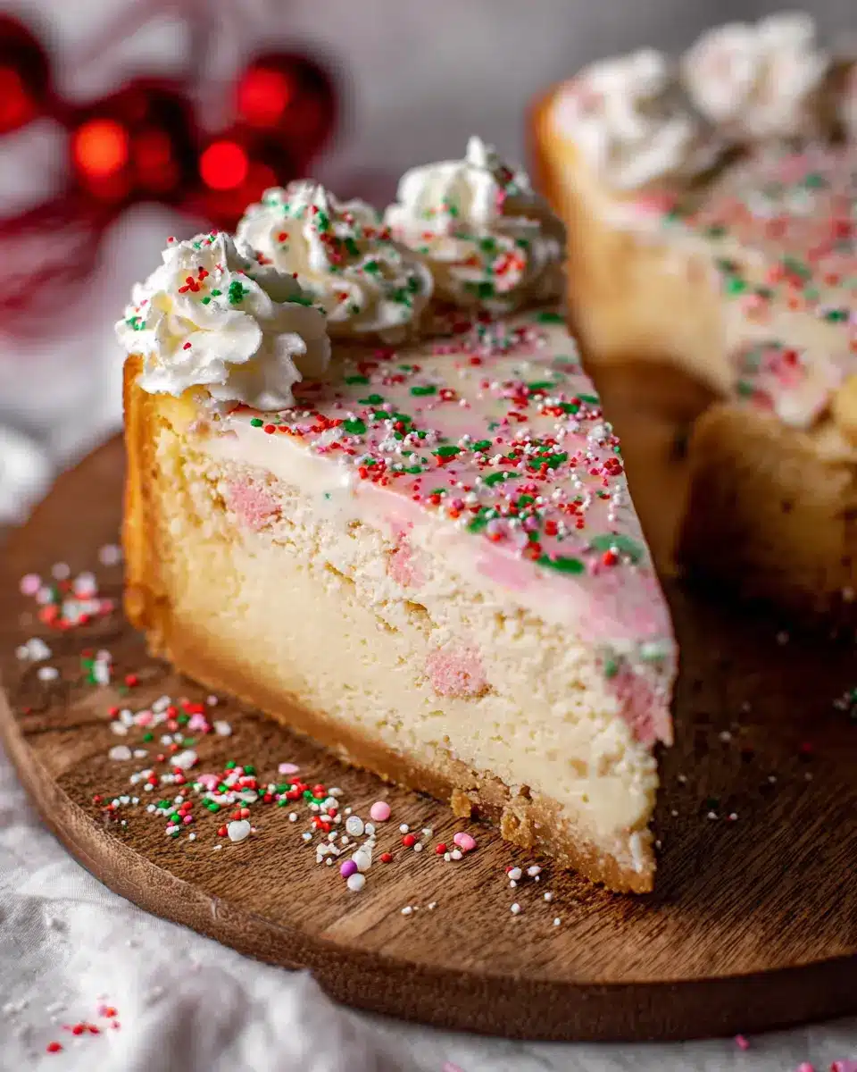 This frosting adds a fun touch and enhances the festive vibes of your Sugar Cookie Cheesecake.